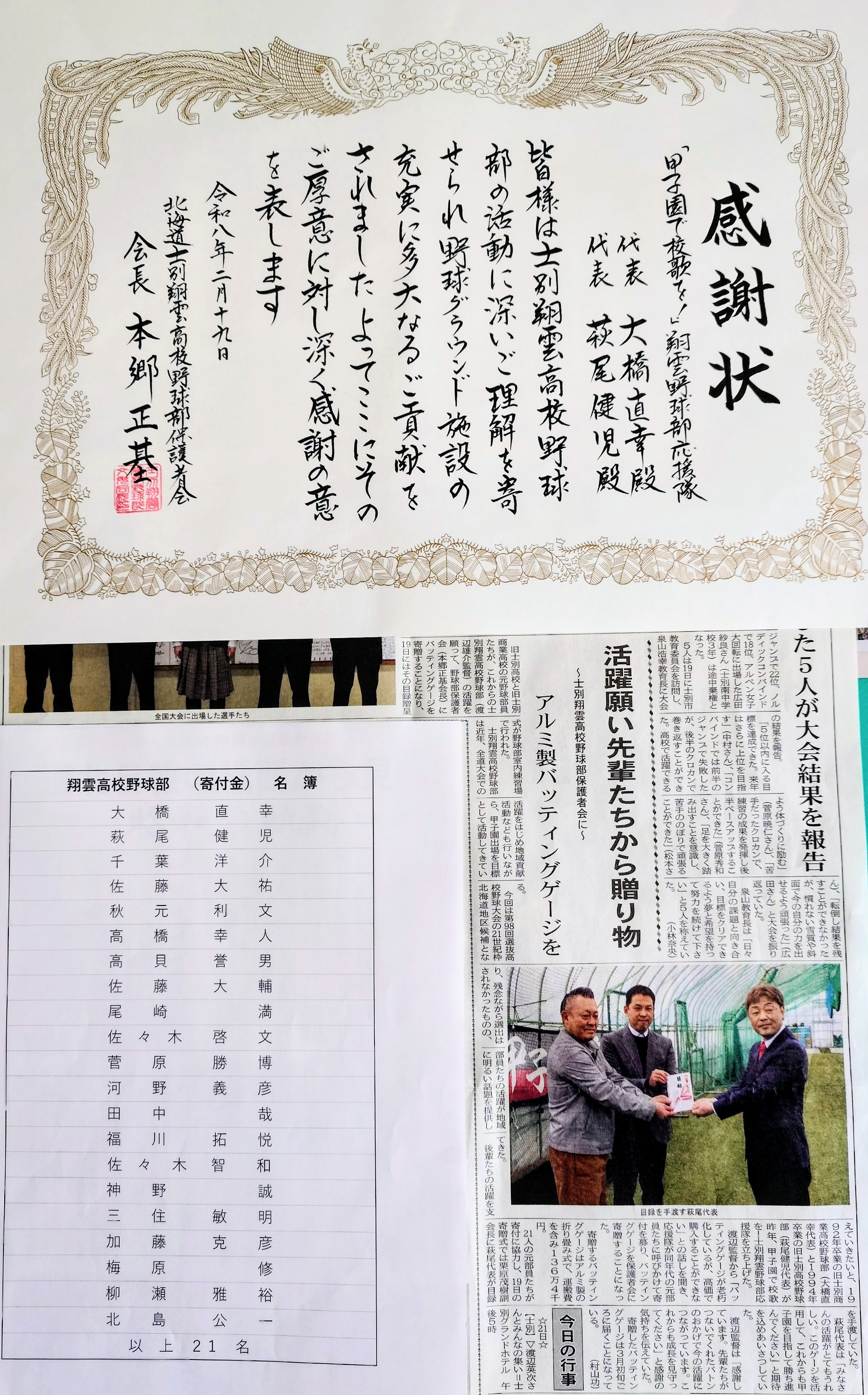 先日 21名の有志一同で士別翔雲高校野球部に感謝と激励の